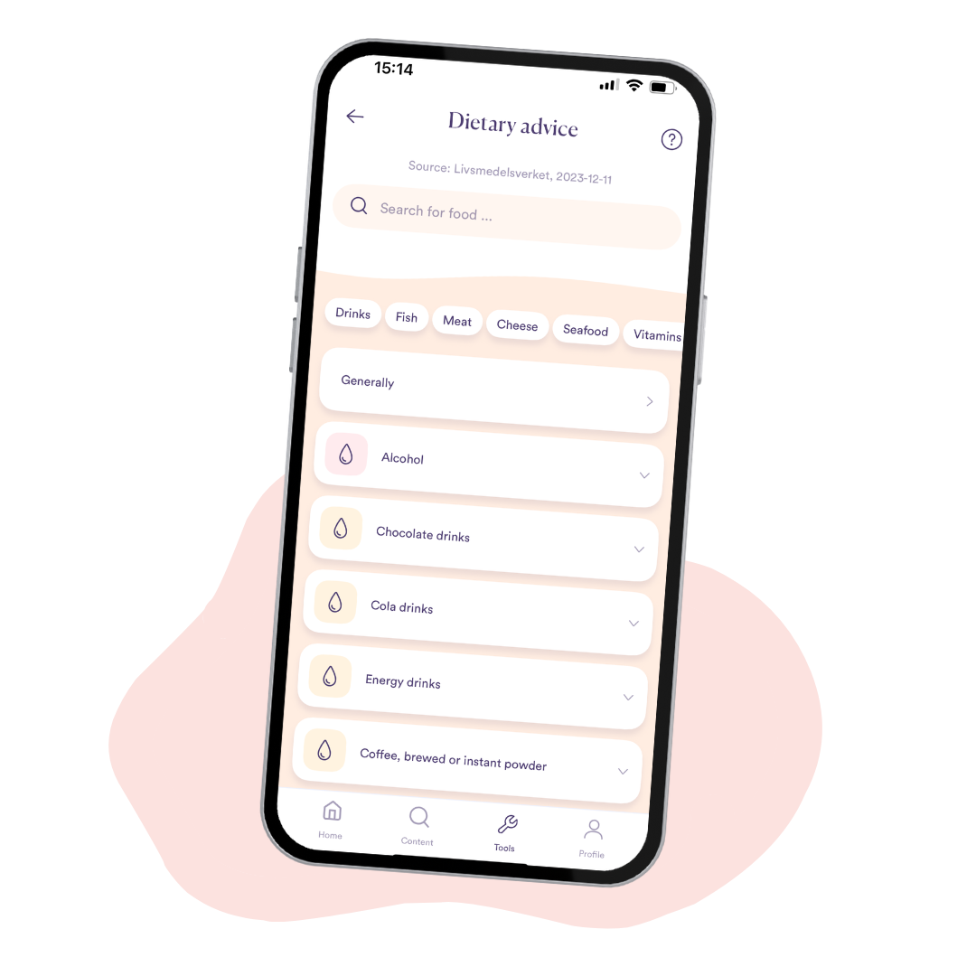 You will find carefully crafted dietary advice from in the app. This ensures that you have access to reliable and science-based advice on nutrition and eating habits during pregnancy. This advice is important for the health of both you and your baby, and helps you make informed choices about your diet.