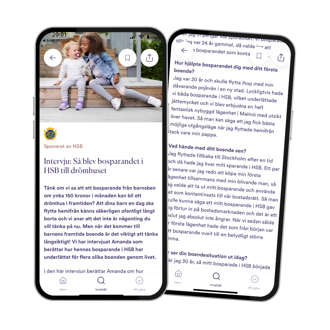 We chose to visualize what long-term savings for your children can lead to in order to make something that is far in the future more tangible. We did this by turning the article into a personal interview with a 30-year-old whose parents saved via HSB. By showing that a small amount per month has led to someone’s first rental apartment, first home purchase and finally their dream house, we inspired and motivated the target group to take action. As a call to action to HSB’s own landing pages on home saving, a competition was also promoted where the prize was a 100,000 SEK cash deposit for the child’s future home. The article was placed in the app’s finance and parenting category so that users looking for this type of inspiration could easily find it.